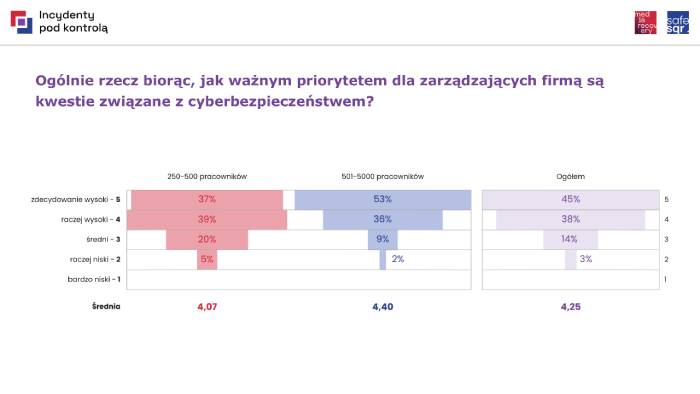 Tak w badaniu wyglądały średnie wyniki dla całej grupy, natomiast w podziale przedsiębiorstw pod kątem liczby zatrudnionych pojawiły się znaczące różnice. Wśród przedstawicieli firm zatrudniających od 250 do 500 pracowników, 37 proc. oceniło swoje podejście do cyberbezpieczeństwa na 5 (zdecydowanie wysoki priorytet), 39 proc. na 4 (raczej wysoki priorytet), a 20 proc. na 3 (średni). Wśród firm zatrudniających powyżej 500 pracowników, aż 53 proc. wskazało najwyższą wagę 5, 35 proc. – 4 a 9 proc – 3. To pokazuje, że największe przedsiębiorstwa traktują kwestie związane z cyberbezpieczeństwem z nieco wyższą wagą, co może wynikać nie tylko z większej świadomości i możliwości budżetowych, ale także z faktu, że muszą być one gotowe na nowe regulacje jako pierwsze.
