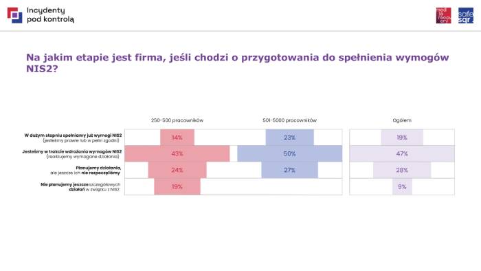 Istotnym aspektem w kontekście cyberbezpieczeństwa są nadchodzące zmiany regulacyjne, czyli nowelizacja ustawy o Krajowym Systemie Cyberbezpieczeństwa, która ma wprowadzić zalecenia dyrektywy NIS2. Jak zatem polskie przedsiębiorstwa są przygotowane na nowe zasady? Okazuje się, że wszystkie firmy – nawet te, których regulacje nie obejmują bezpośrednio – słyszały o nowych wymogach. Inaczej wygląda jednak kwestia przygotowania. Aż 43 proc. ankietowanych przedsiębiorstw nadal pozostaje na etapie wdrażania zmian, 24 proc. dopiero planuje działania, a 19 proc. nie rozpoczęło jeszcze żadnych przygotowań. Zaledwie 14 proc. badanych zadeklarowało, że w dużym stopniu spełnia wymagania wynikające z dyrektywy NIS2.