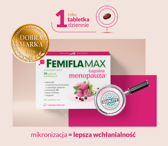 Femiflamax to potęga fitoterapii – suplement diety, którego starannie dobrane składniki, wzmacniają wzajemnie swoje działanie i łagodzą dolegliwości związane z menopauzą. Preparat zawiera ekstrakt z czerwonej koniczyny, ekstrakt z czarnego pieprzu, witaminę B6, kwas foliowy i magnez.